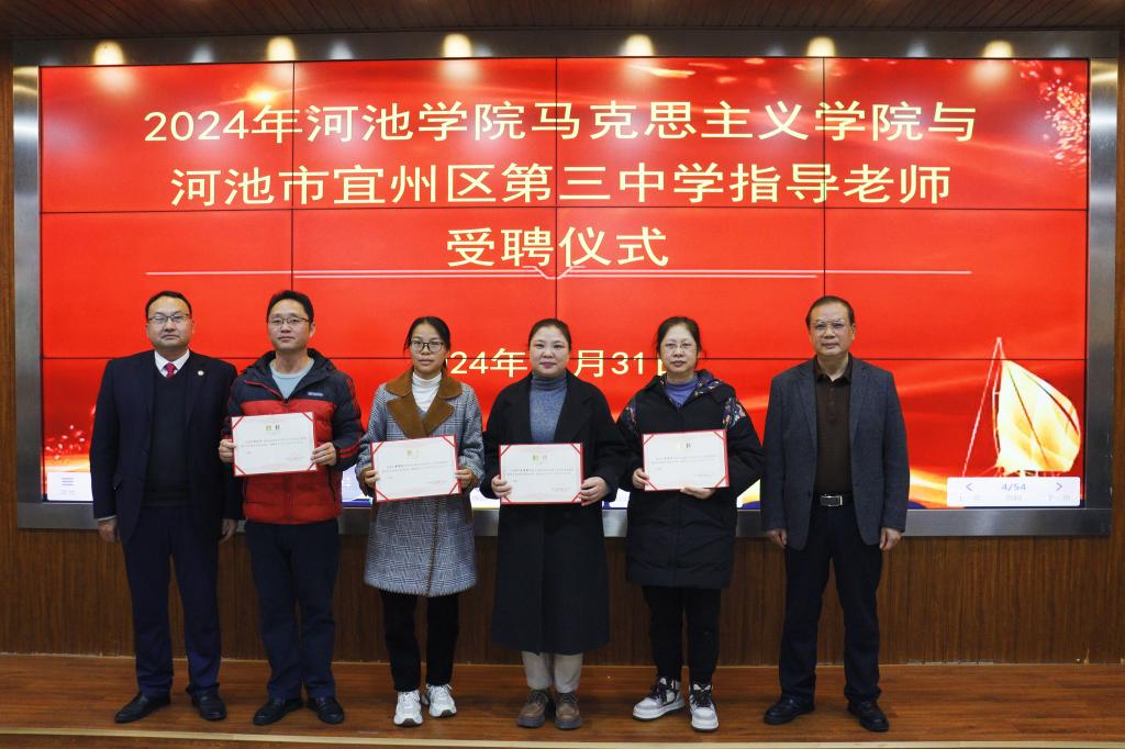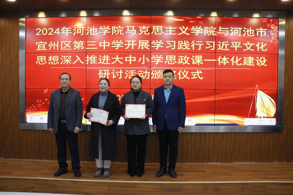 闭幕式中,首先由必威西汉姆联执行院长江洪明就两校合作开展大中小学思政课一体化建设研讨活动进行总结,并同宜州区第三中学兰雄刚校长一起为本次教学课例展示教师以及两校师生合作参加2024年全国大学生数字素养与技能大赛荣获一等奖的获奖者进行颁奖。随后还举行了河池学院必威西汉姆联与河池市宜州区第三中学指导老师互聘仪式。