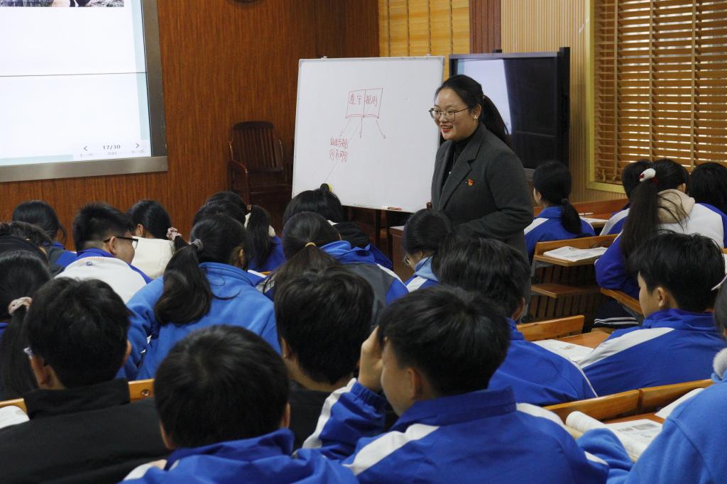 本次研讨活动主要以“同课异构”形式展开交流学习。在授课环节中,我院思想政治教育专业2022级2班莫黄心月同学与宜州区第三中学石海燕老师共同选取上八年级上册道德与法治第二单元第三课《遵守规则》教学内容进行授课。莫黄心月在授课过程中教态自然、创设教学情境引人入胜,巧妙设计问题、案例和游戏,课堂气氛活跃,深受在场中学生的欢迎。石海燕老师的授课主要采用任务驱动法、案例法、对比法等方式展开教学,循循善诱的教学特点体现了对思政课本质是讲道理的精准把握,巧妙地把河池市红色文化资源“严守纪律,不拿群众一针一线”渗透到教学内容中,做到教学观点和教学内容相统一,值得点赞和学习。整个教学课堂信息大、重难点突出、以案说理,做到情理交融,有助于学生形成正确的价值观和道德观。