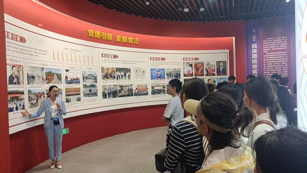 在罗城仫佬族自治县成立40周年成就展示馆内,师生们通过历史资料、老照片和展品深入了解罗城仫佬族自治县在党的正确领导下,带领各族人民在政治建设、经济建设、文化旅游、社会事业、生态文明、城市建设、乡村振兴、民族团结等方面取得的伟大成就。