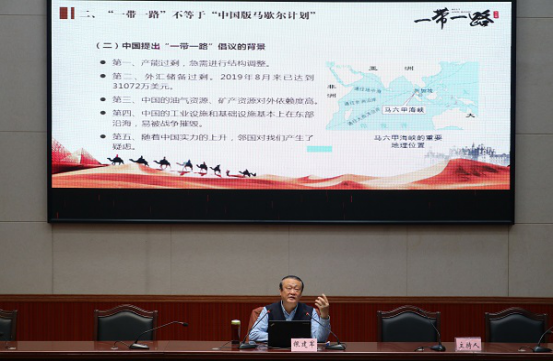 10月27日晚,银建军教授在弘毅楼1-205报告厅作“一带一路与中华民族伟大复兴”人文素养专题讲座,我院2019级全体学生到场聆听。