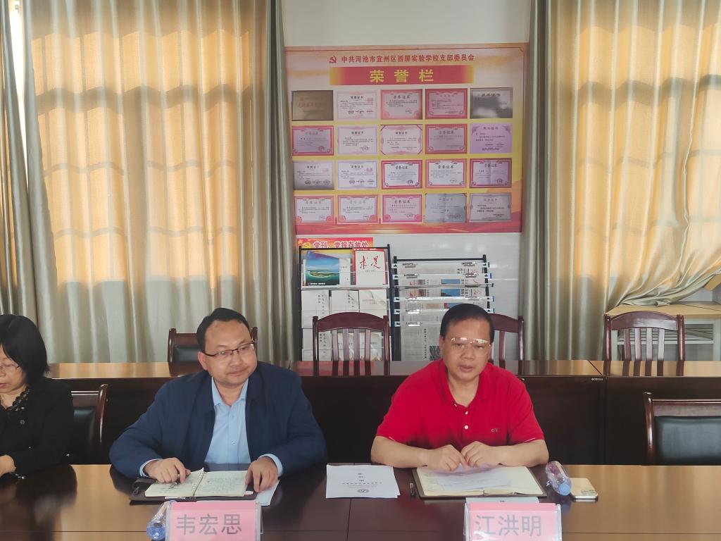 在覃爽校长及学校相关领导的陪同下,江洪明一行参观了河池市宜州区西屏实验学校教学楼、学生宿舍、学生活动区以及办公区。期间,覃爽介绍了西屏实验学校的发展历程、整体办学规模以及办学理念,让与会同志对西屏实验学校有了更深入地了解。参观结束后,双方就进一步的合作事宜举行了交流座谈会,会议由河池市宜州区西屏实验学校校长覃爽主持。