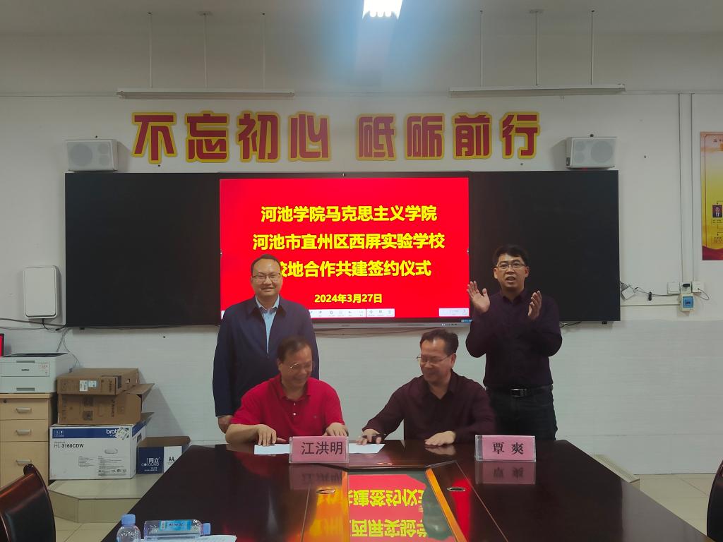 江洪明对西屏实验学校的热情接待表示了感谢,并指出西屏实验学校能在不到六年的时间内取得如今的成绩是可喜可贺的,关心、支持并深化与贵校合作是我们学院的重点工作之一,也是我院贯彻落实学校关于加强校地合作相关指示、深化大中小学思想政治教育一体化以及做好2024年思想政治教育专业认证的必然要求。江洪明强调,我院发展正值机遇期,在学术研究、人才结构、党建业务等方面具有诸多优势,与贵校存在许多合作发展的契机,希望可以持续交流,寻找更多的合作点以及合作方式,促进我院与贵校共同发展。韦宏思就本次合作的重点——2024年思想政治教育专业认证情况进行了具体介绍,双方就合作事宜进行了具体协商。座谈会后,为巩固合作成果,方便继续深化合作,双方举行了校地合作共建签约仪式。