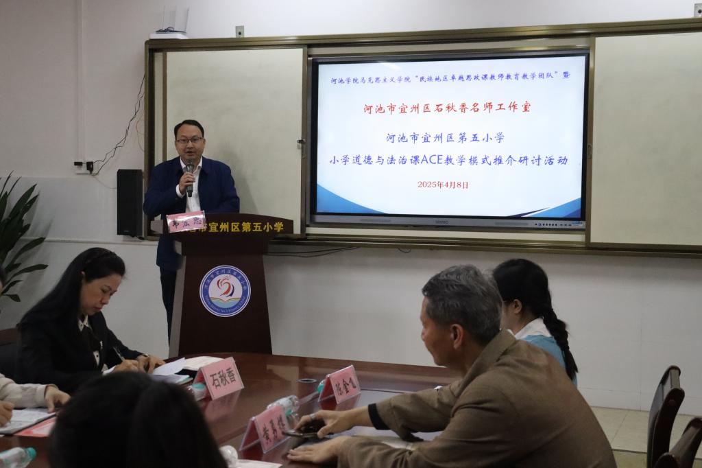 2025年4月8日,为深入贯彻落实习近平总书记关于思政课建设的重要指示精神,推进大中小学思想政治教育一体化建设,河池学院必威西汉姆联与河池市宜州区第五小学举办“共建周”小学道德与法治课ACE模式推介研讨活动。河池学院必威西汉姆联副院长韦宏思、“民族地区卓越思政课教师教育教学团队”负责人黄勇樽教授、教学团队成员陈金飞老师,河池市宜州区第五小学韦娜校长、思想道德与法治教研组任课教师,河池市宜州区石秋香名师工作室主持人石秋香老师、名师工作室名誉顾问梁秀华以及名师工作室成员们,河池学院思想政治教育专业2022级、2023级师范生参加。本次活动由莫惠评和苏立科主持。