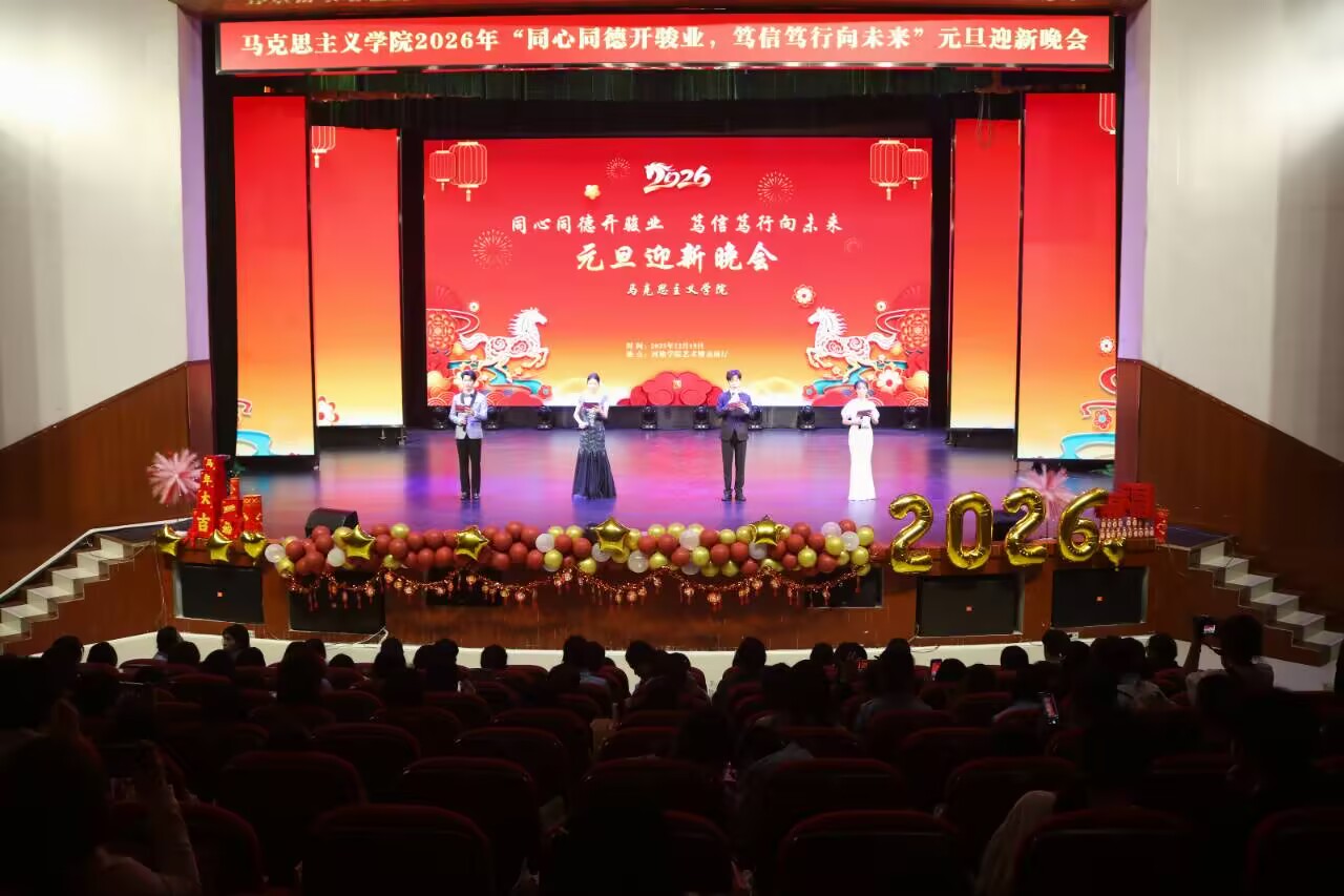 骏马踏春启新岁,思想逐光向未来。12月19日晚,必威西汉姆联“同心同德开骏业,笃信笃行向未来”2026年主题元旦晚会于东区艺术楼演播厅举行。学院党委书记韦建益、院长江洪明、副院长张明进、院团委书记黄挺龙、办公室副主任韦喜芬、辅导员卢巍丹、银琳杏等老师与全院学子齐聚一堂,共迎2026新年到来。
